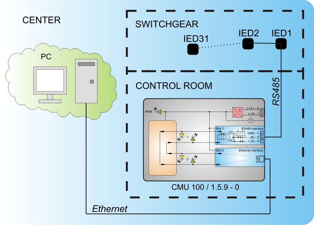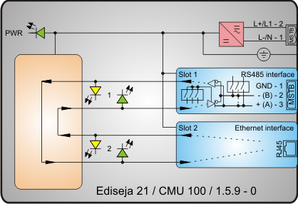 This type of CMU 100 device is RS485 to 10/100Base-Tx converter. Data is converted from RS485 to 10/100Base-Tx and vice versa.