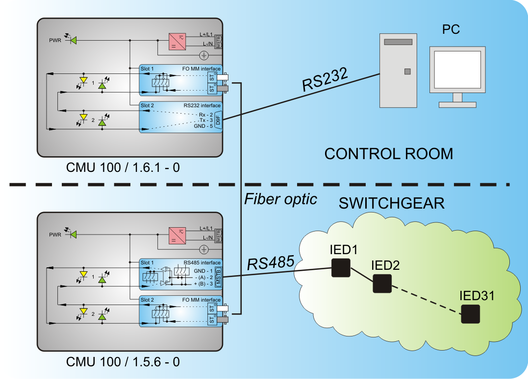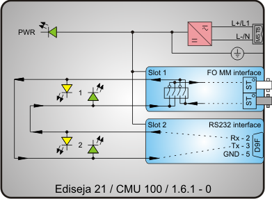 This type of CMU 100 device is multimode fiber optic to RS232 converter. Data is simultaneously converted from multimode fiber optic to RS232 and vice versa.