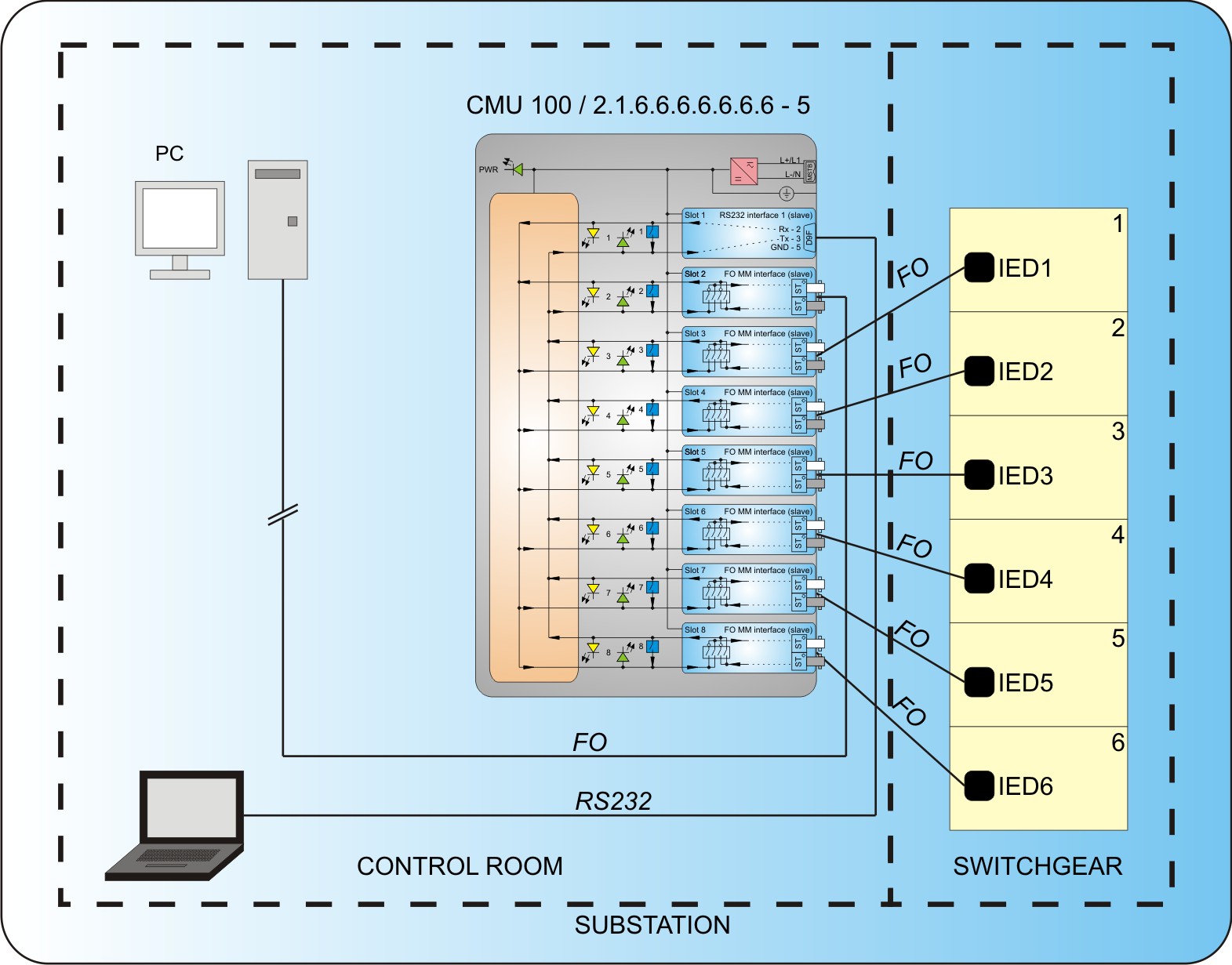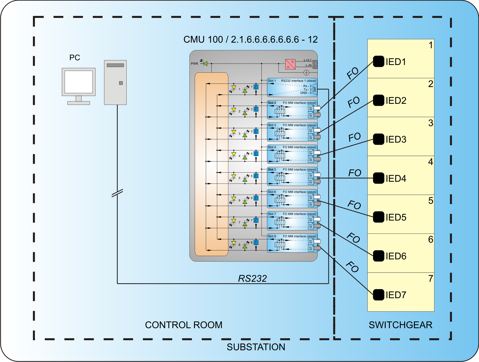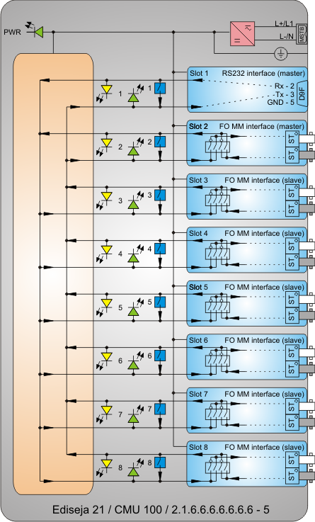 1x master (RS232) up to 7x slaves (fiber optic) model types: